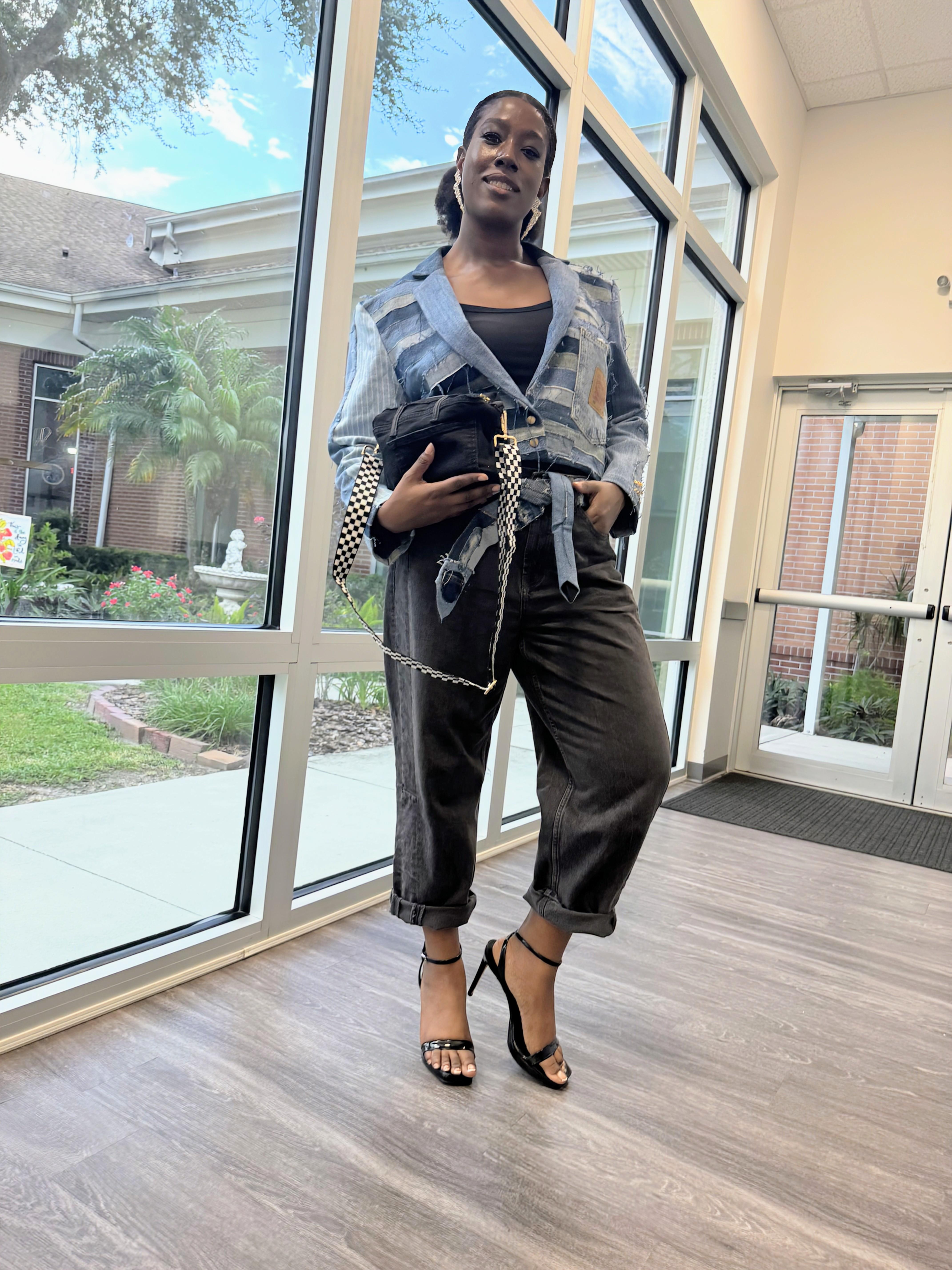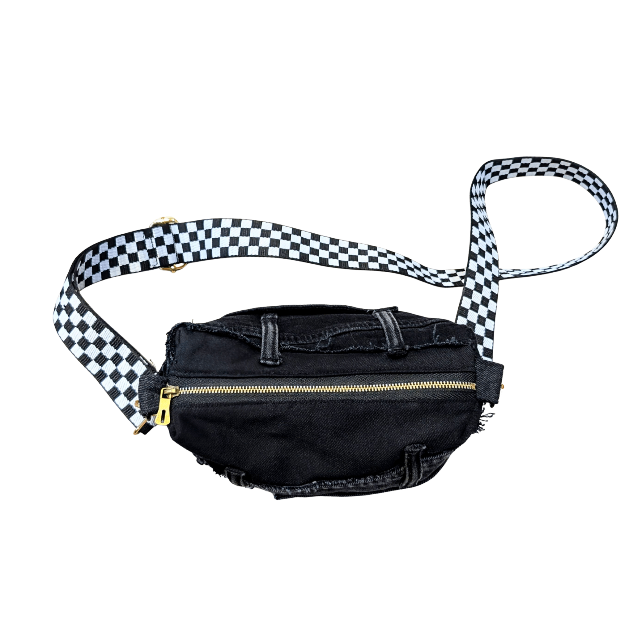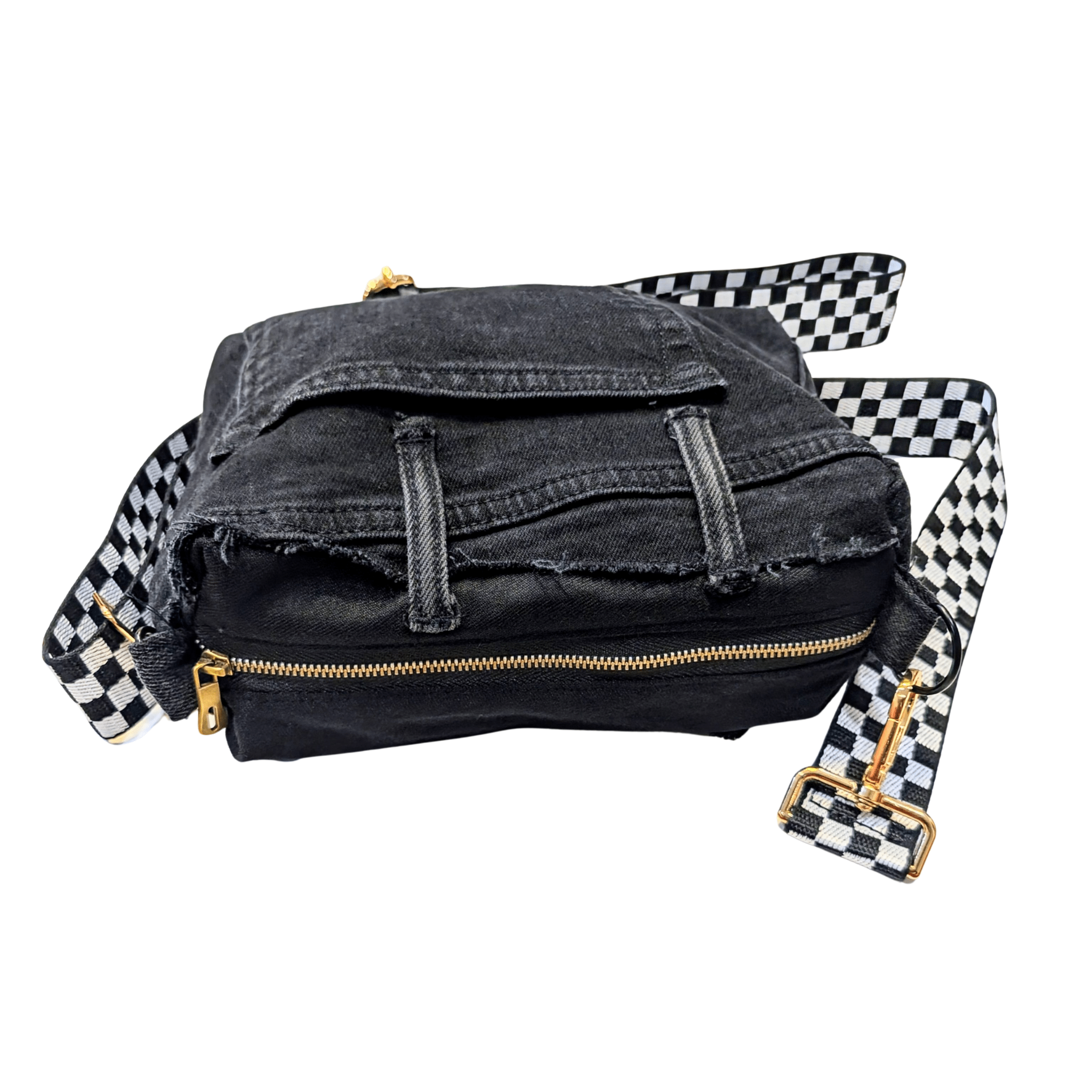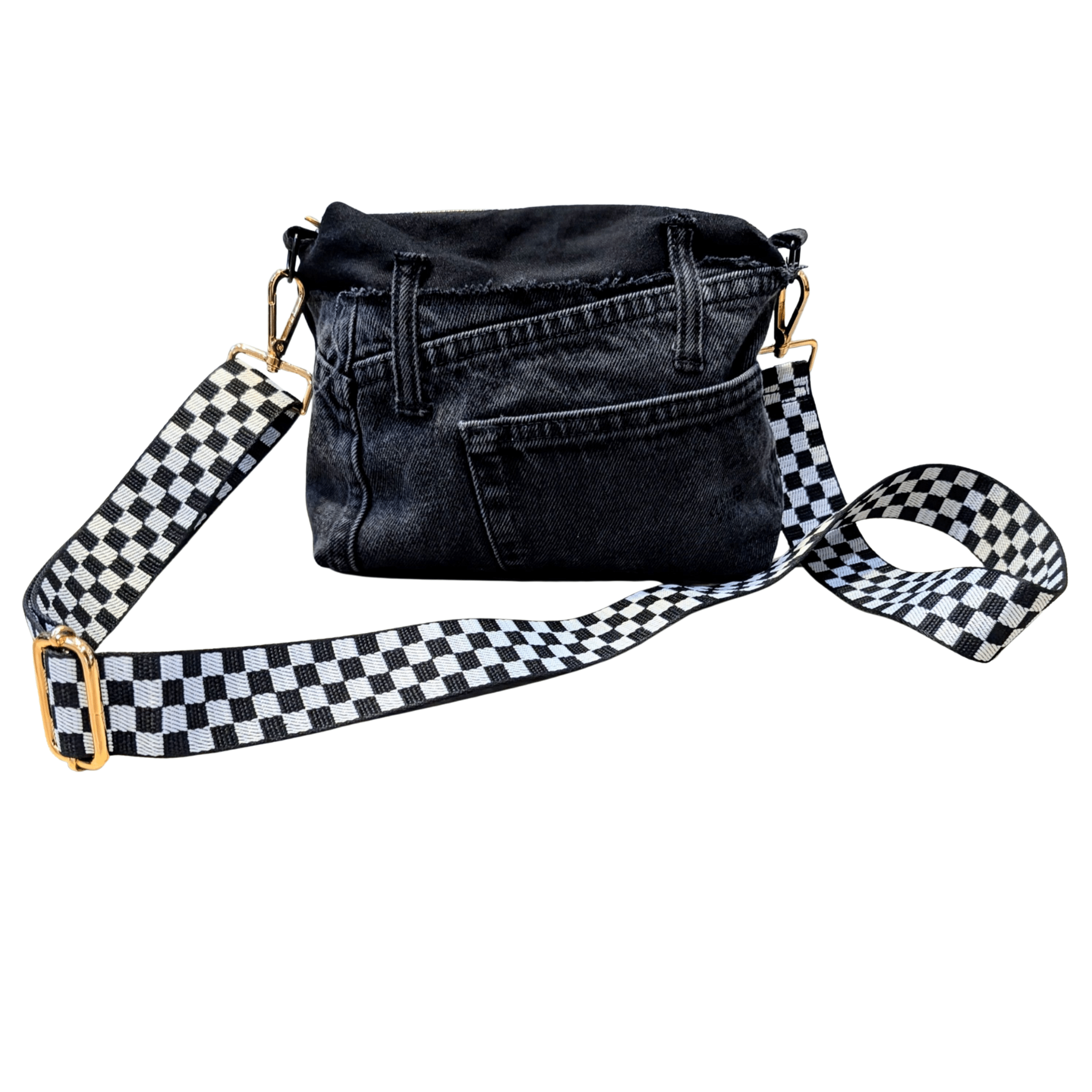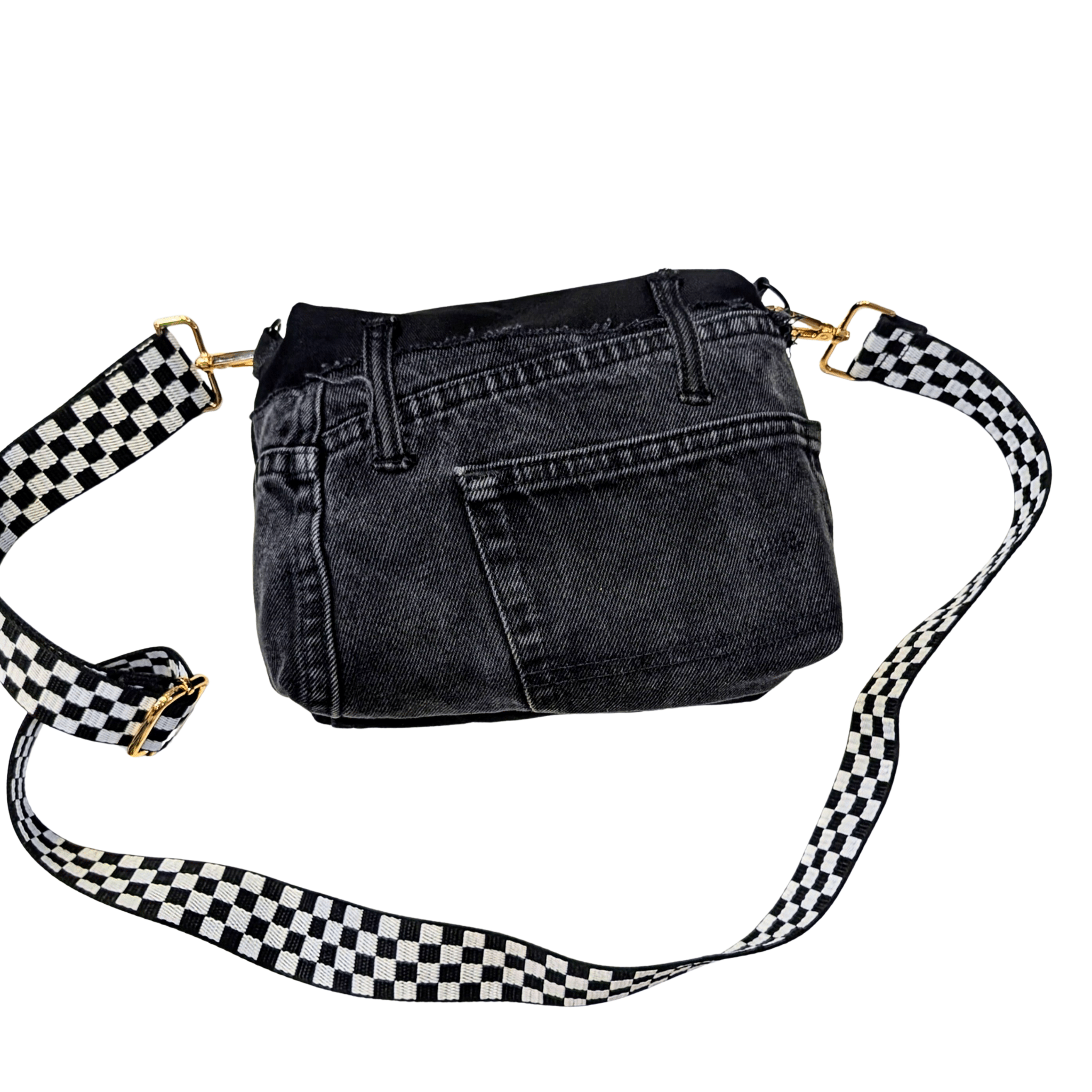 Stand out with this one-of-a-kind Black Distressed Denim Patchwork Crossbody Bag, designed for those who embrace individuality. Made from upcycled denim with raw edges, frayed details, and a functional pocket, this bag blends streetwear grit with sustainable style. The adjustable checkerboard strap and gold hardware give it a bold finish, making it the perfect everyday statement piece.