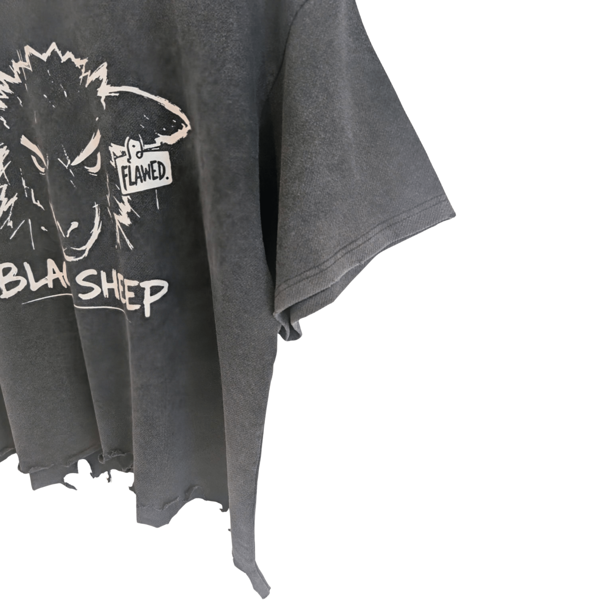 The oversized boxy fit and drop shoulders create a relaxed silhouette, while the distressed hem and subtle grind details add a raw, rebellious edge. Finished with the Flawed Black Sheep graphic, this piece stands as a reminder that being different was always the point.