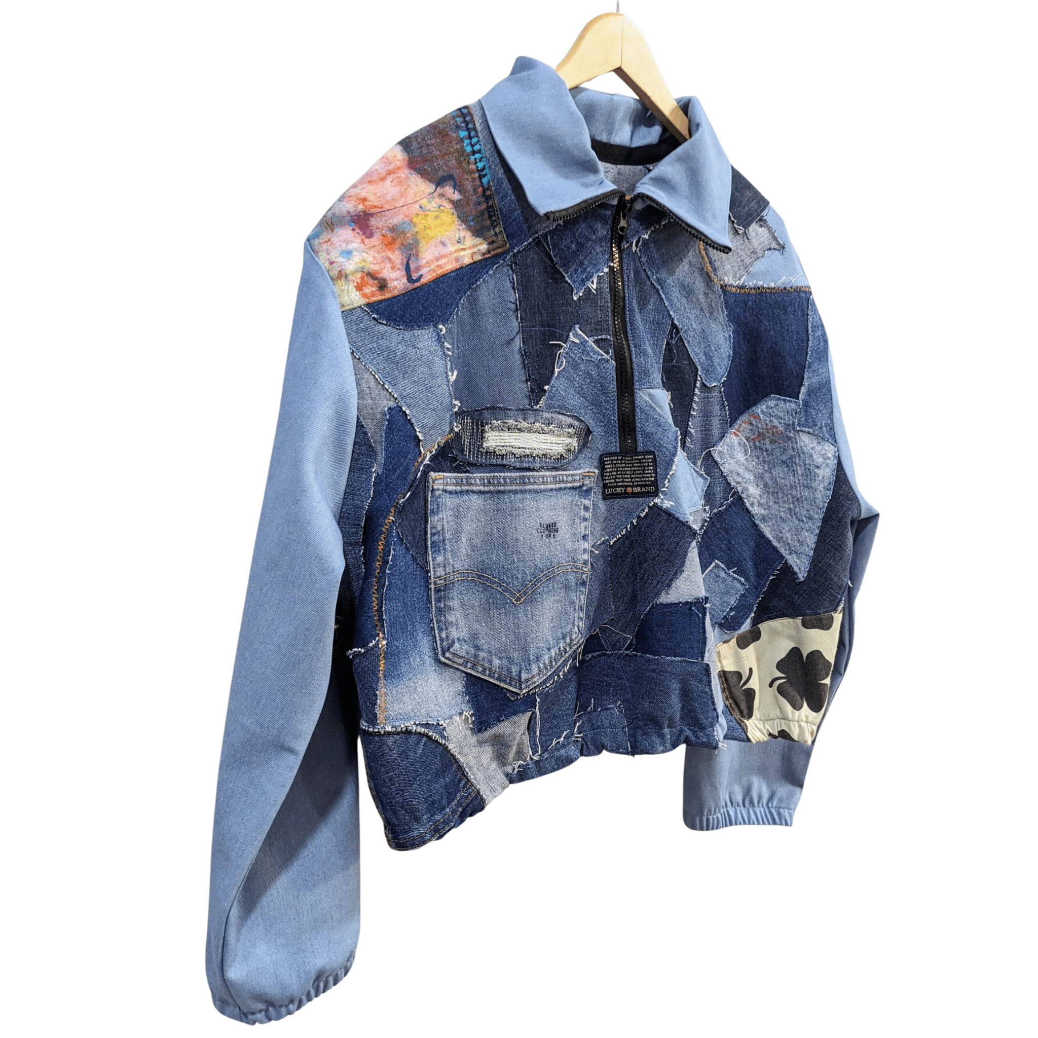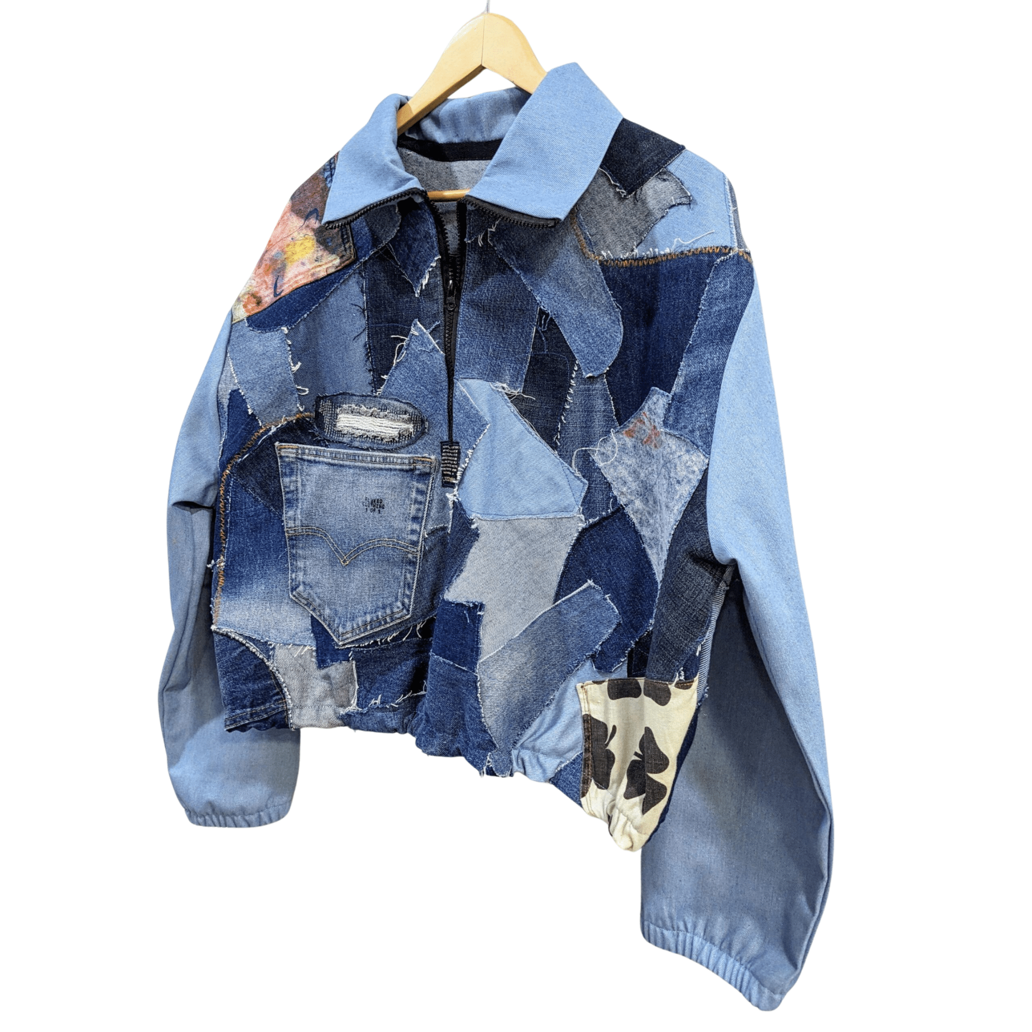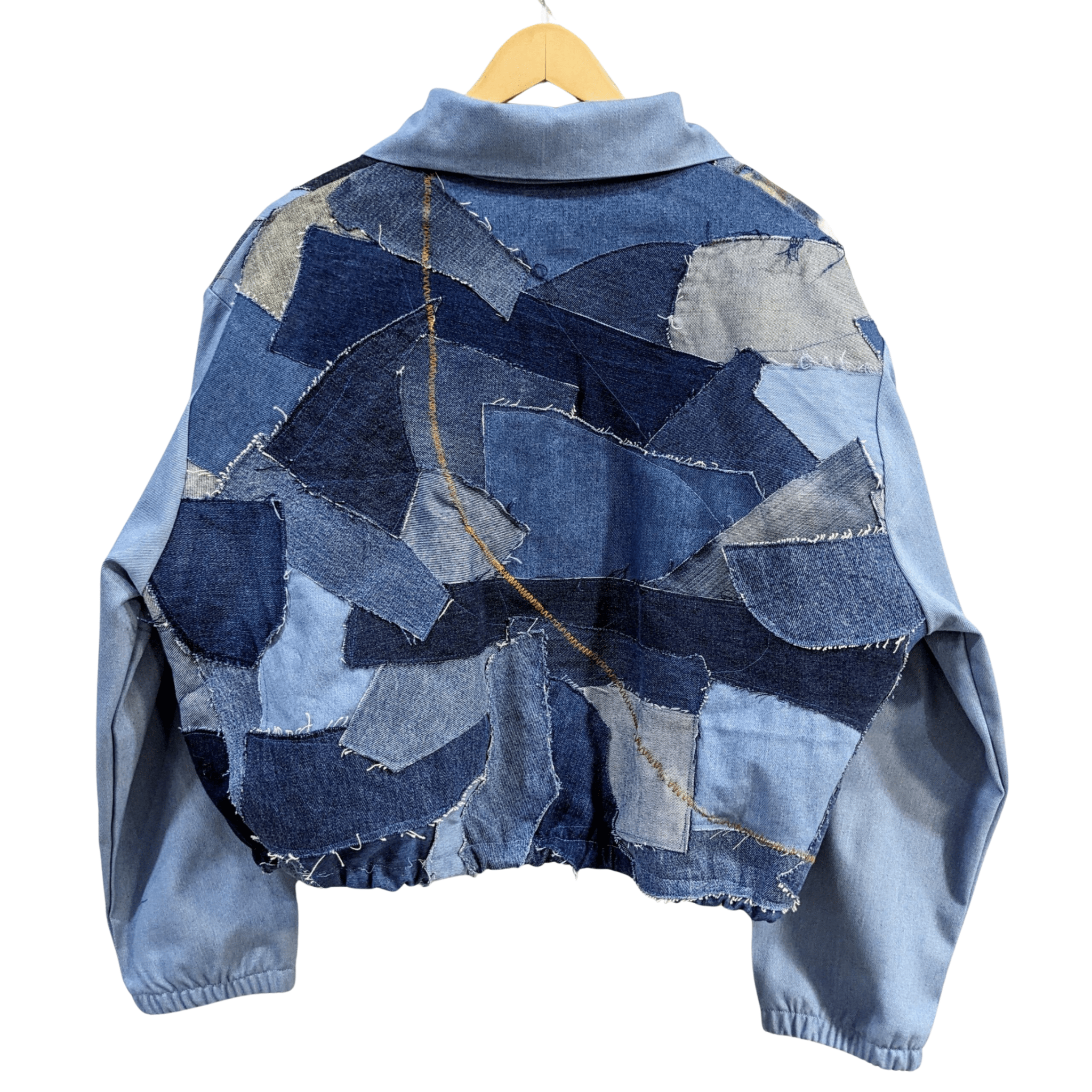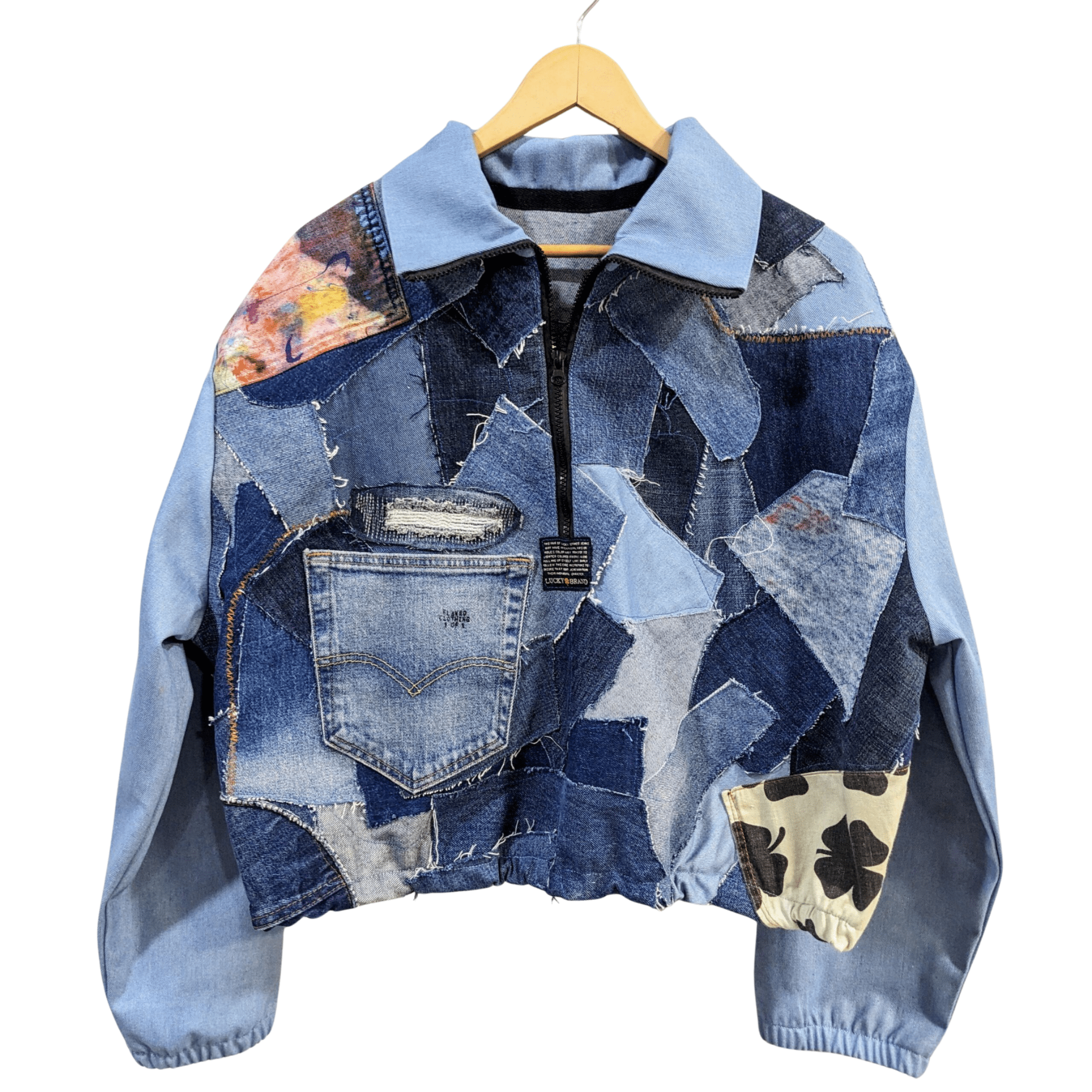 This cropped jacket is reconstructed from reclaimed denim, layered and stitched into a one-of-one patchwork composition. Raw edges, exposed seams, and contrasting washes tell a story of wear, rebuild, and reinvention.