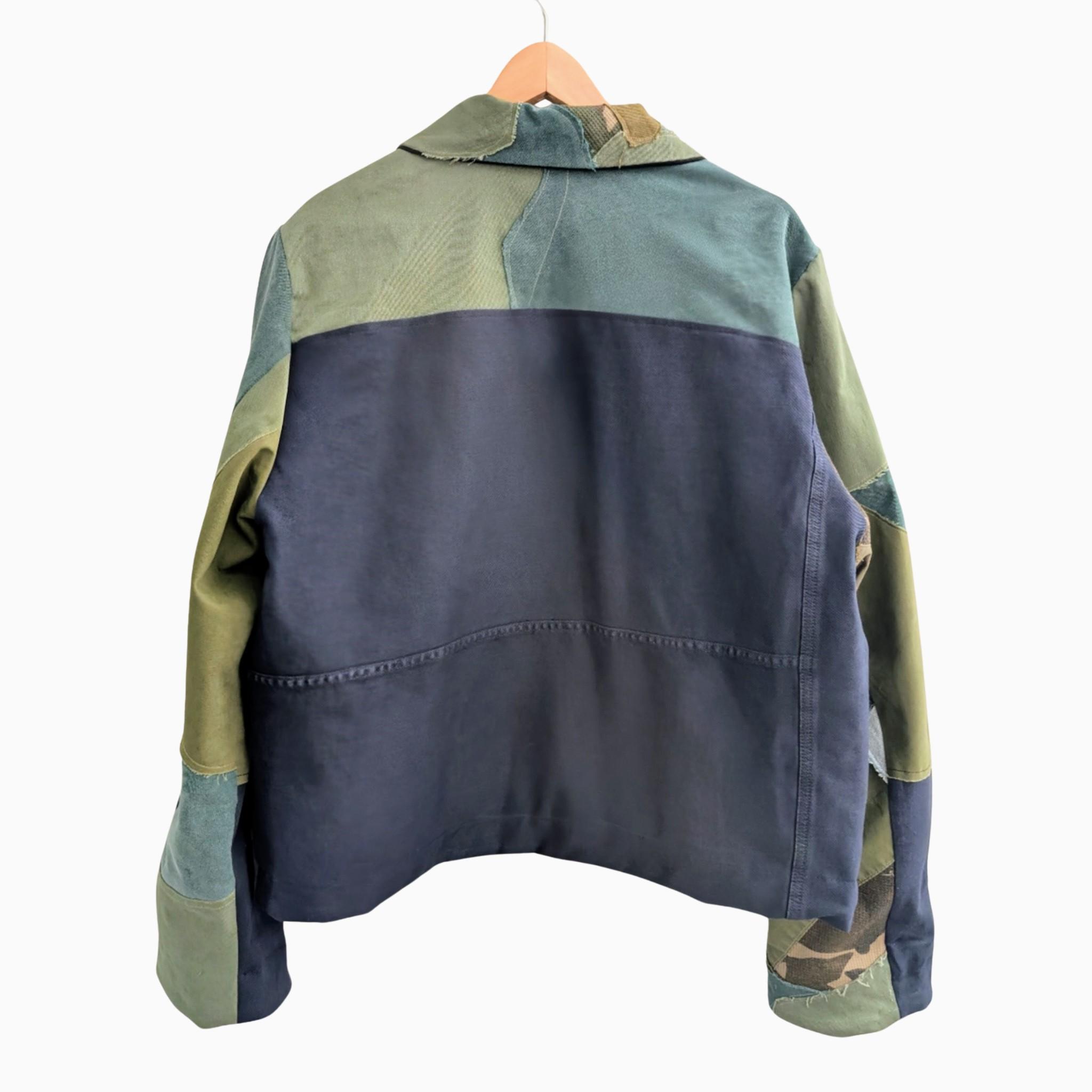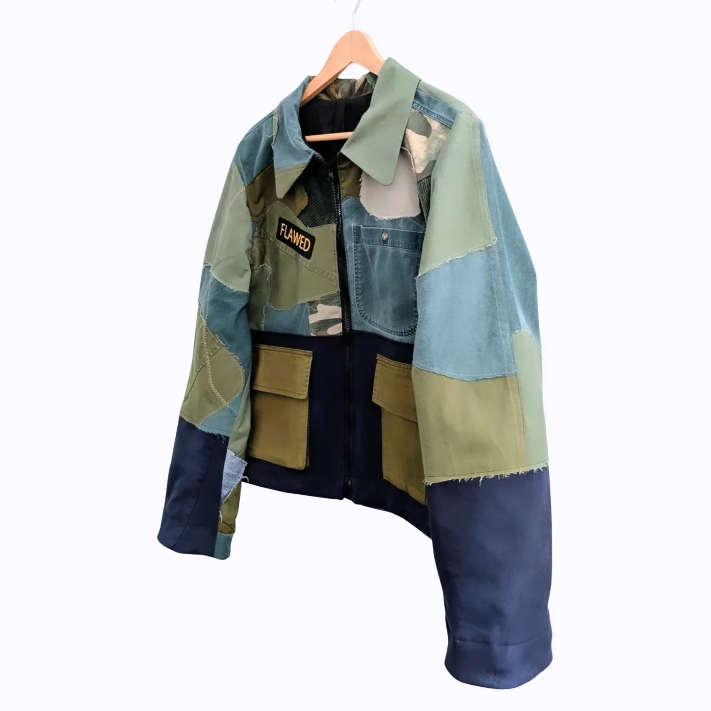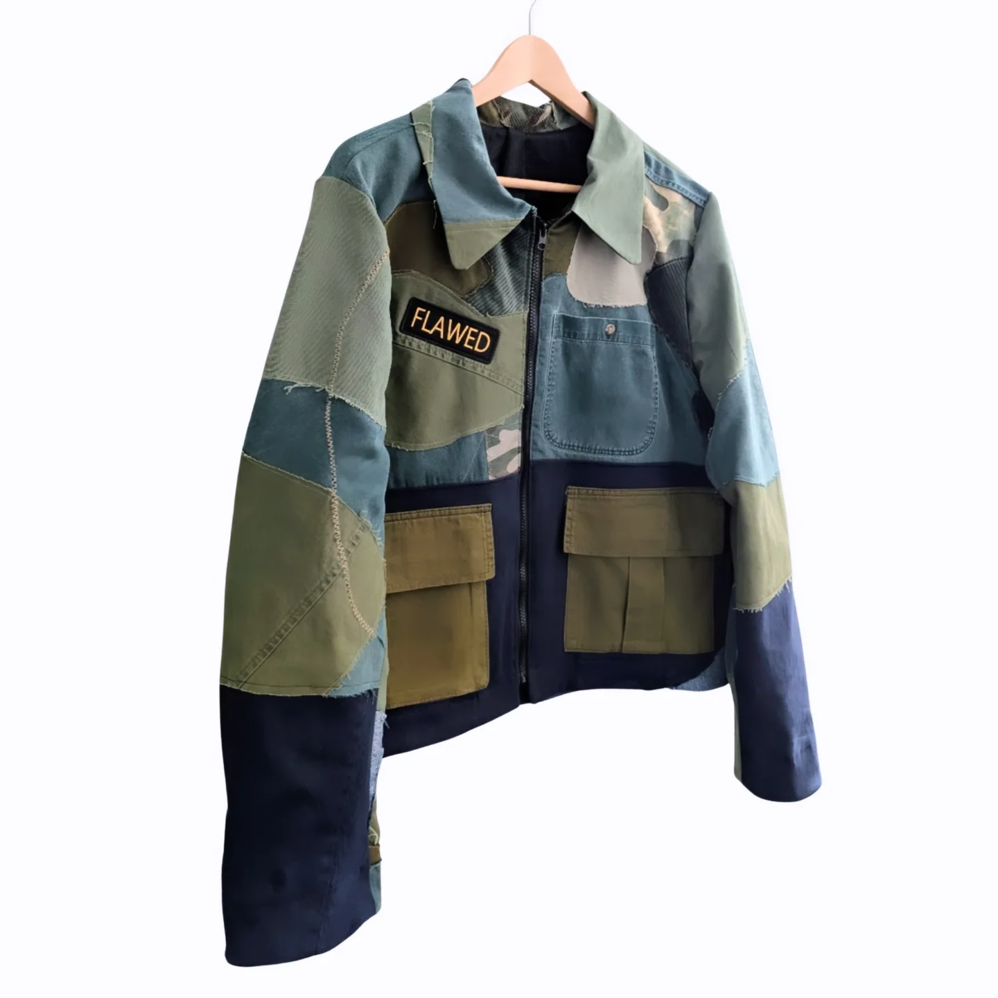 Perfectly imperfect — just like you. The Flawed Utility Jacket is a handcrafted patchwork piece made from repurposed military and workwear fabrics. Each jacket tells its own story through rugged textures, raw edges, and bold character.