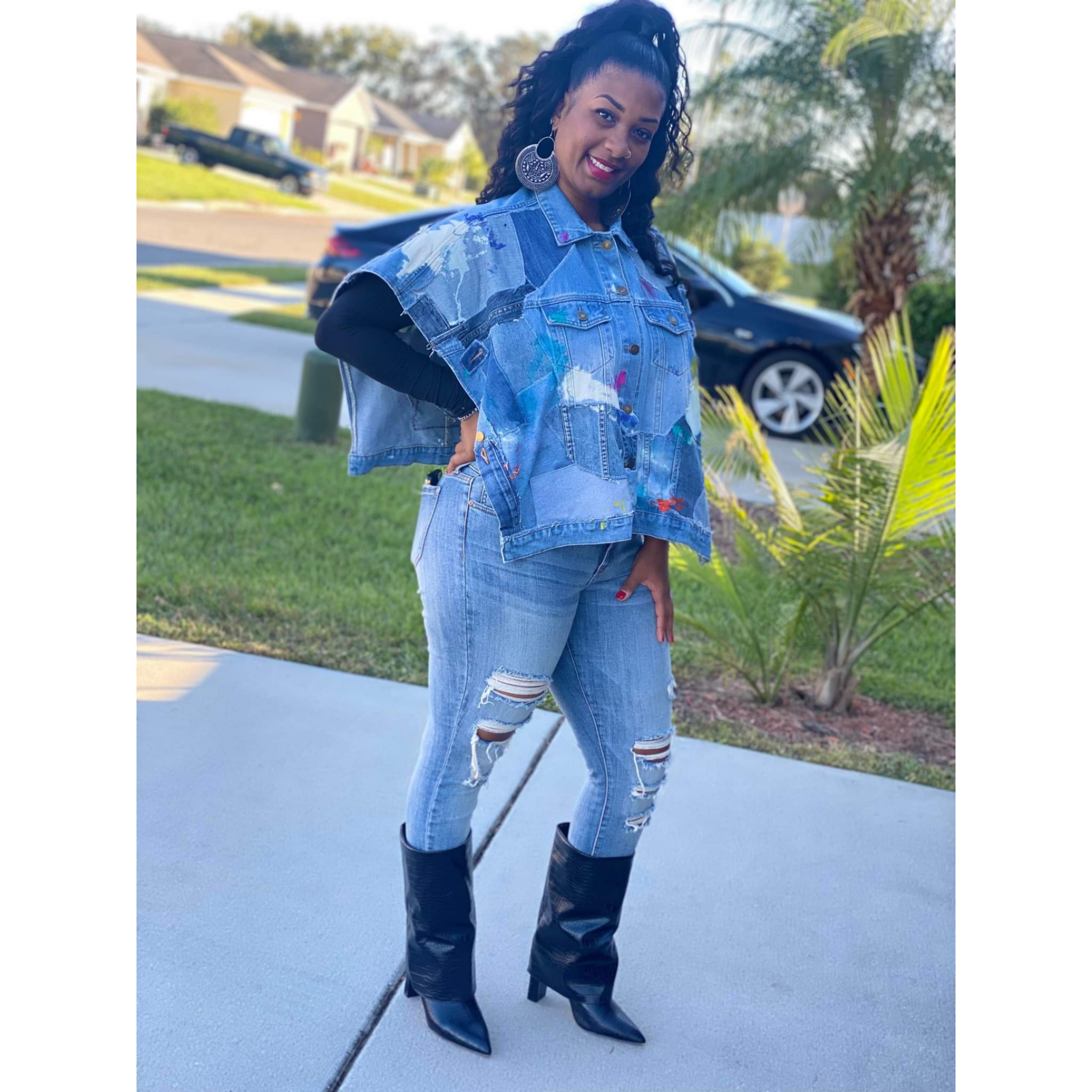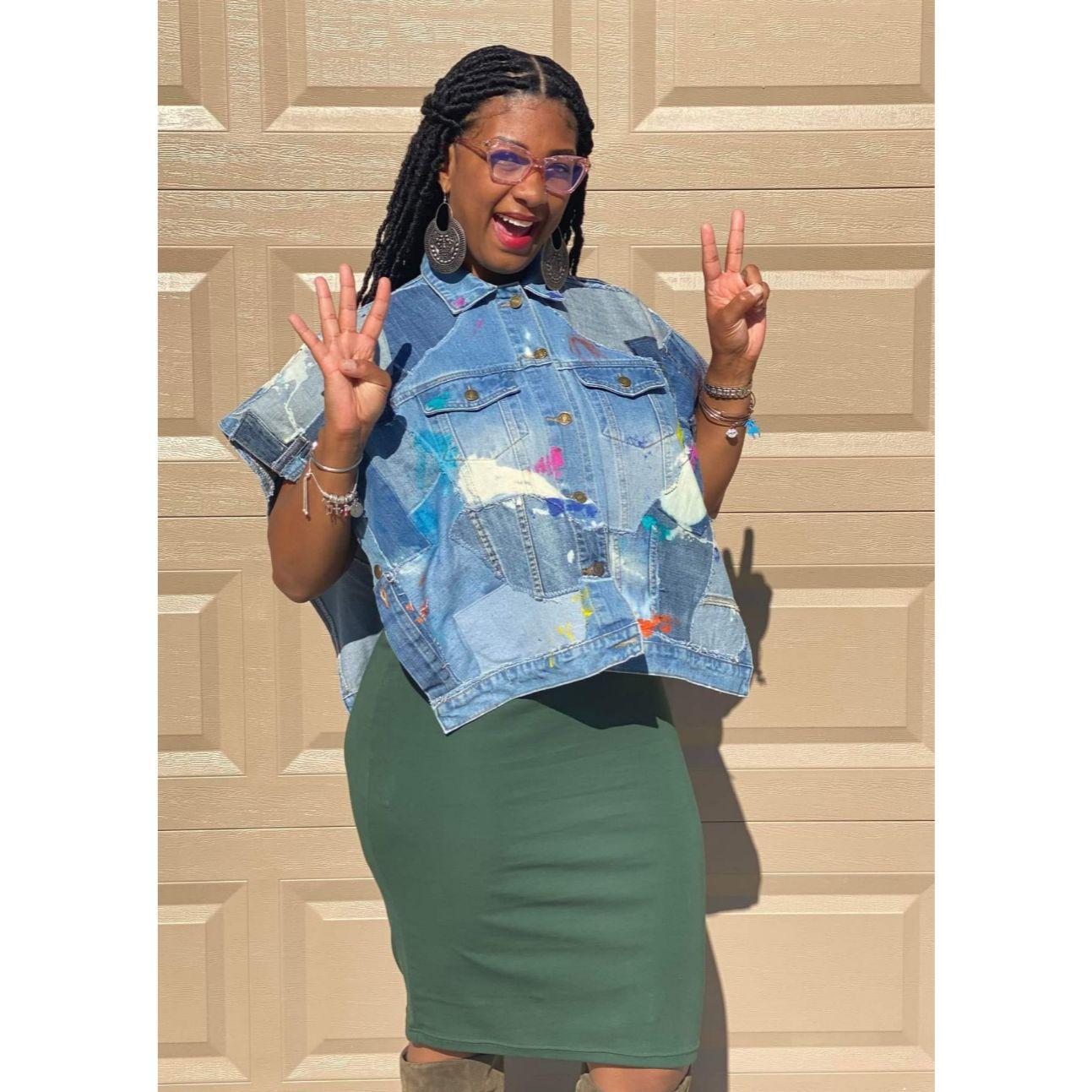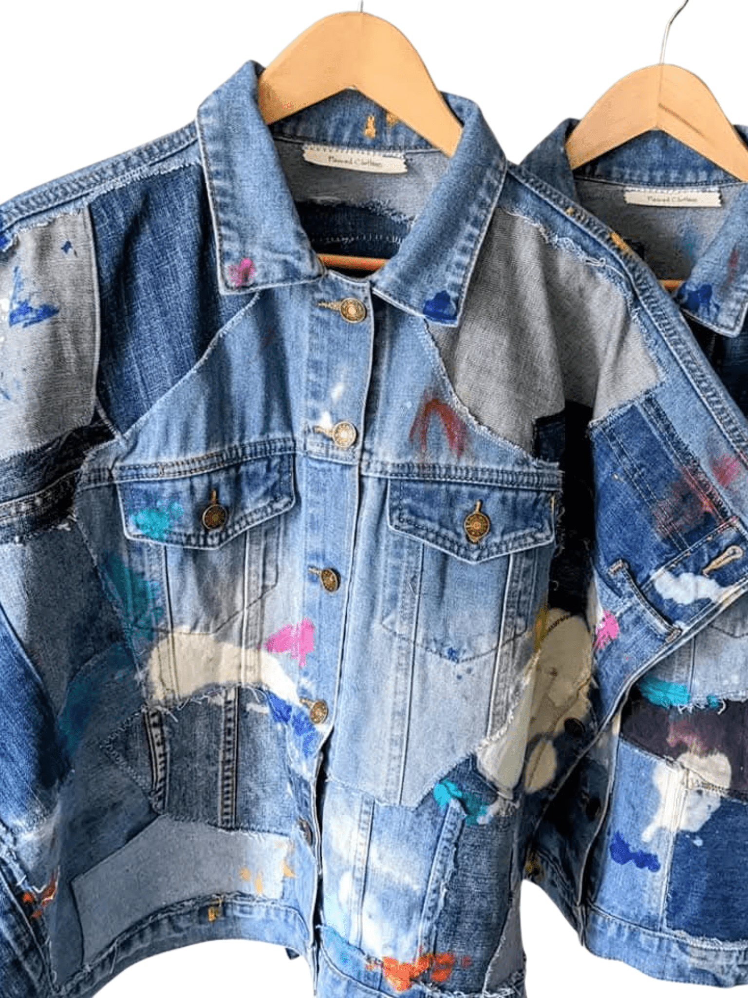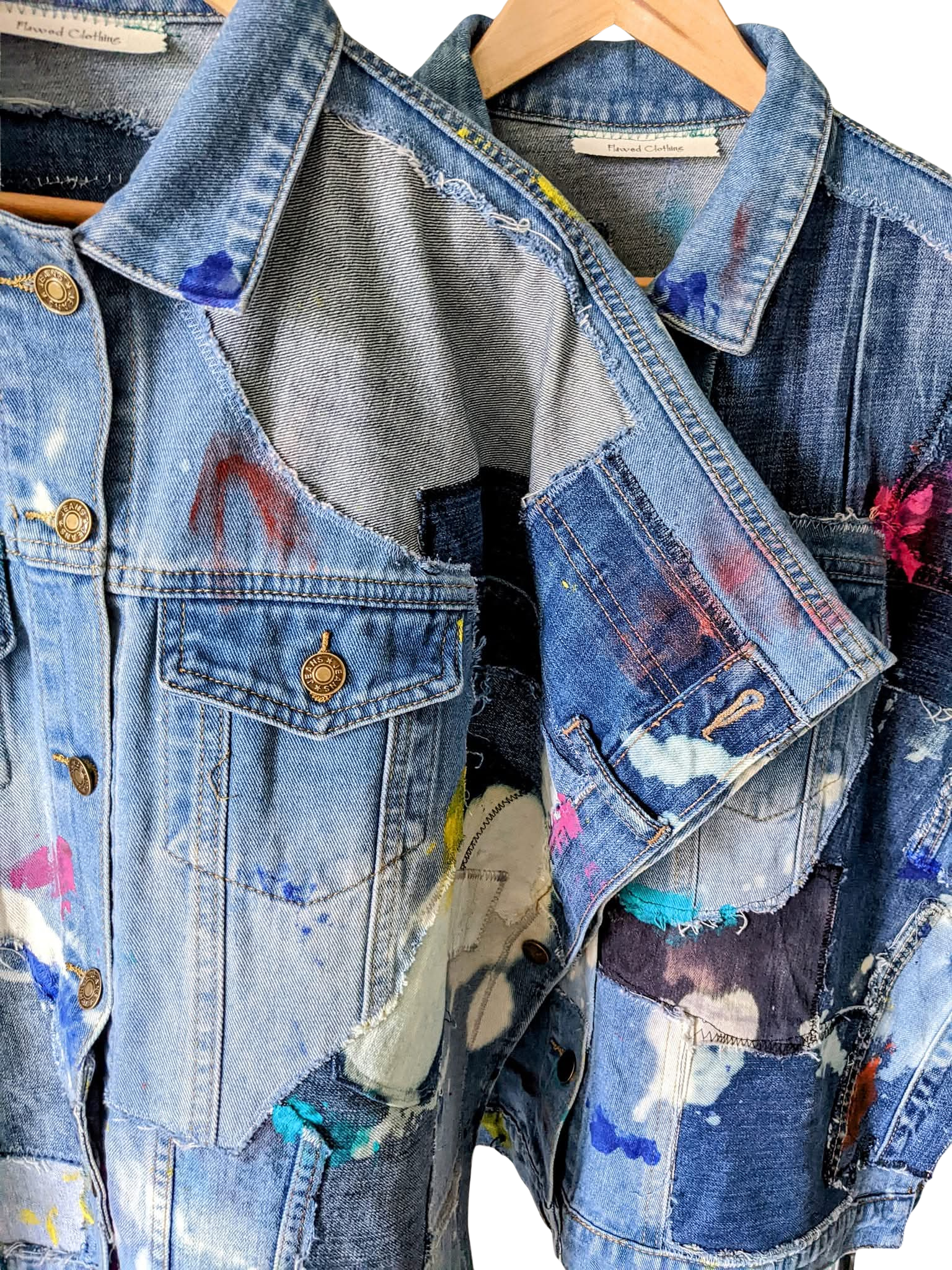Content + Care – Hand-cut and reassembled denim panels – Visible stitching and layered construction – Raw, frayed edges throughout – Hand-painted accents (each piece will vary) – Raw, distressed edges throughout – Pre-Washed Shipping – Ships in 10-14 days